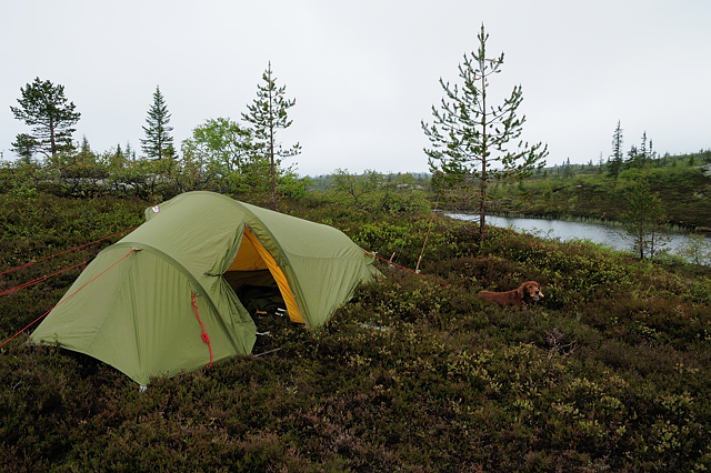 En halv time før midnatt var det såpass mørkt og kaldt at jeg trakk meg inn i teltet for å spise pølser og slå meg til ro for natta. Det ble ikke noe leirbål i dette gufsete været. Bedre å legge seg litt tidlig og være «fit-for-fight» til godværet som ble meldt av «yr.no» til i morgen formiddag.
