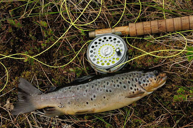 Men den ville ikke smake på flua mi. Ikke lukte på den engang, for det jeg vet. Ikke noen av de andre vakende ørretene jeg kastet på heller. Jeg prøvde litt forskjellige fluer og taktikker. Palmermygg. Paradun. Stripende. Liggende. Vanskelig å se hva fisken vaket etter, men jeg mener det må ha vært noen bittesmå fjærmygger. Først når jeg satte på ei lita brun paradun og endret taktikk til å kaste blindt ut på bleika så langt ut jeg kunne og bare la godbiten ligge og ligge og ligge fikk jeg kontakt. Nok en finfin fjellørret på et par og tredve cm gav meg en fin liten kamp på den mjuke treerstanga.